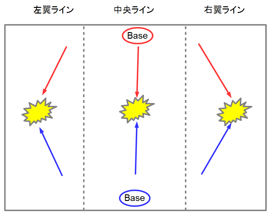 まずこのゲームの基本として戦線が3つあります。 左翼、中央、右翼の3つです。 MAPにも縦長長方形型、横長長方形型、正方形方、四角対角型と様々ありますが どのMAPでもこの3戦線は変わりません。 この各自戦線の押し引き、競り合いで勝敗が決まってきます。