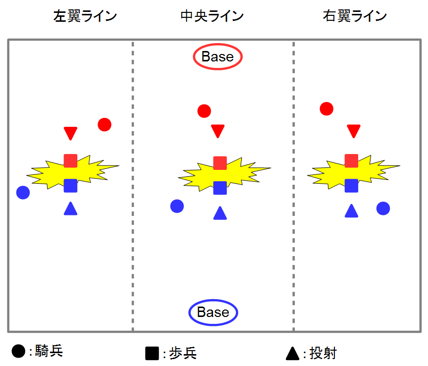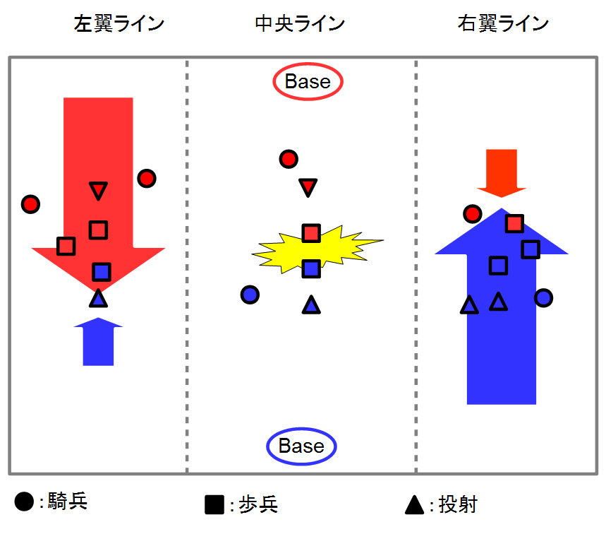 1戦線3ユニットずつで各戦線を戦うのが理想です。 さらに兵科バランス的には1戦線に歩兵・騎兵・投射歩兵が揃っているのが一番の理想です。 これが理想ではありますが、こんなに綺麗に行くことはまずありえません。 マッチングの問題もさながら、兵科の相性や個々の意思なども関ってきますので確実に偏ります。 さらに意図的に偏らせて敵本拠点を押さえる、敵の背後を取る、等の戦術もあります。